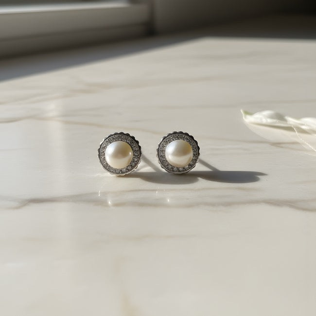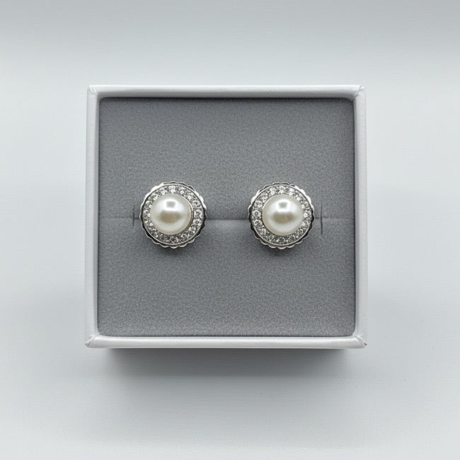 Elevate your elegance with these 925 Sterling Silver Pearl Stud Earrings. Each earring features a lustrous white pearl framed by a halo of sparkling cubic zirconia stones, all set in a beautifully scalloped sterling silver base. Perfect for both everyday sophistication and special occasions, these earrings blend classic charm with a refined modern touch.