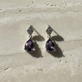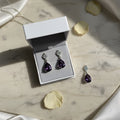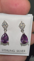 Add a touch of royal glamour to your look with these Sterling Silver Purple Teardrop CZ Dangle Earrings. Featuring a rich amethyst-coloured cubic zircon in a classic pear-shaped drop, each earring is topped with a sparkling diamond-shaped pave stud that catches light beautifully from every angle.