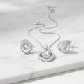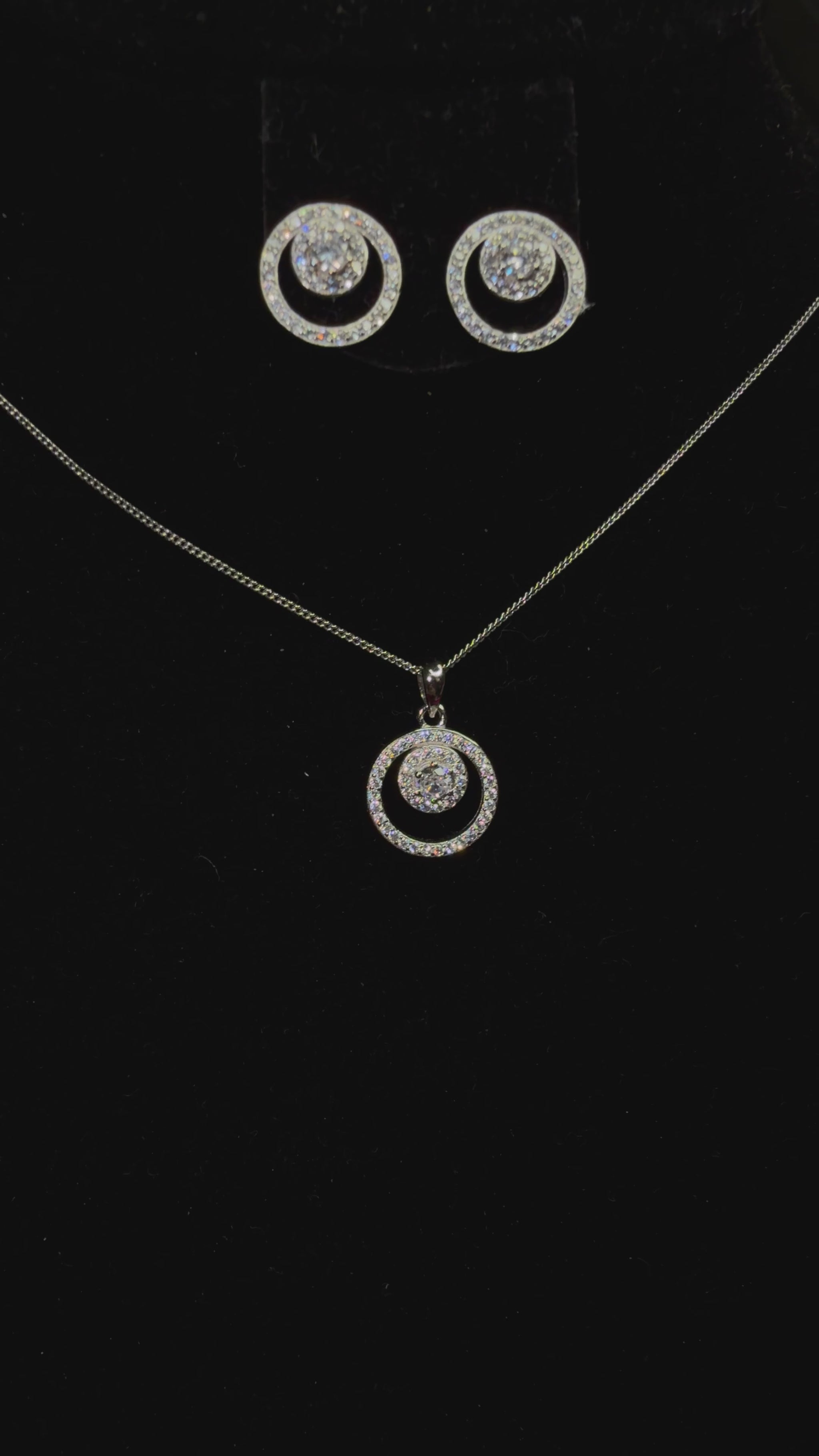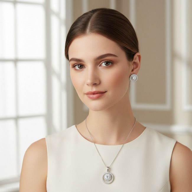 Elevate your style with the timeless beauty of pure silver. This handcrafted jewellery set is made from Solid 925 Sterling Silver and features a brilliant white zircon centre, surrounded by a double halo pf sparkling crystals.