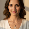 Expertly crafted in a polished silver tone, the pendant is fully outlined with pave-set crystals that catch the light from every angle, creating a dazzling display of brilliance. Suspended on a delicate chain, it sits gracefully on the neckline, adding a touch of magic to both casual tees and evening dresses.