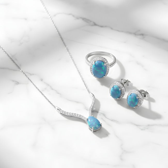 Elevate your style with our breathtaking Blue Fire Opal Jewellery Set. Crafted to perfection, this luxurious set captures the mesmerising deep blue hues of the ocean, surrounded by a halo of sparkling crystals that catch the light from every angle.