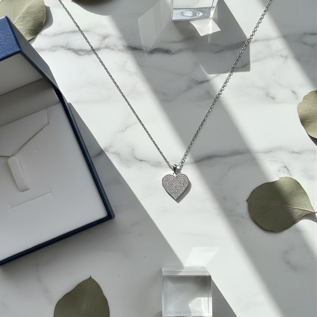 Capture the essence of romance with our Sterling Silver Pave Heart Necklace. A timeless symbol of love, this pendant is crafted from solid 925 Sterling Silver, ensuring lasting shine and durability for everyday wear.
